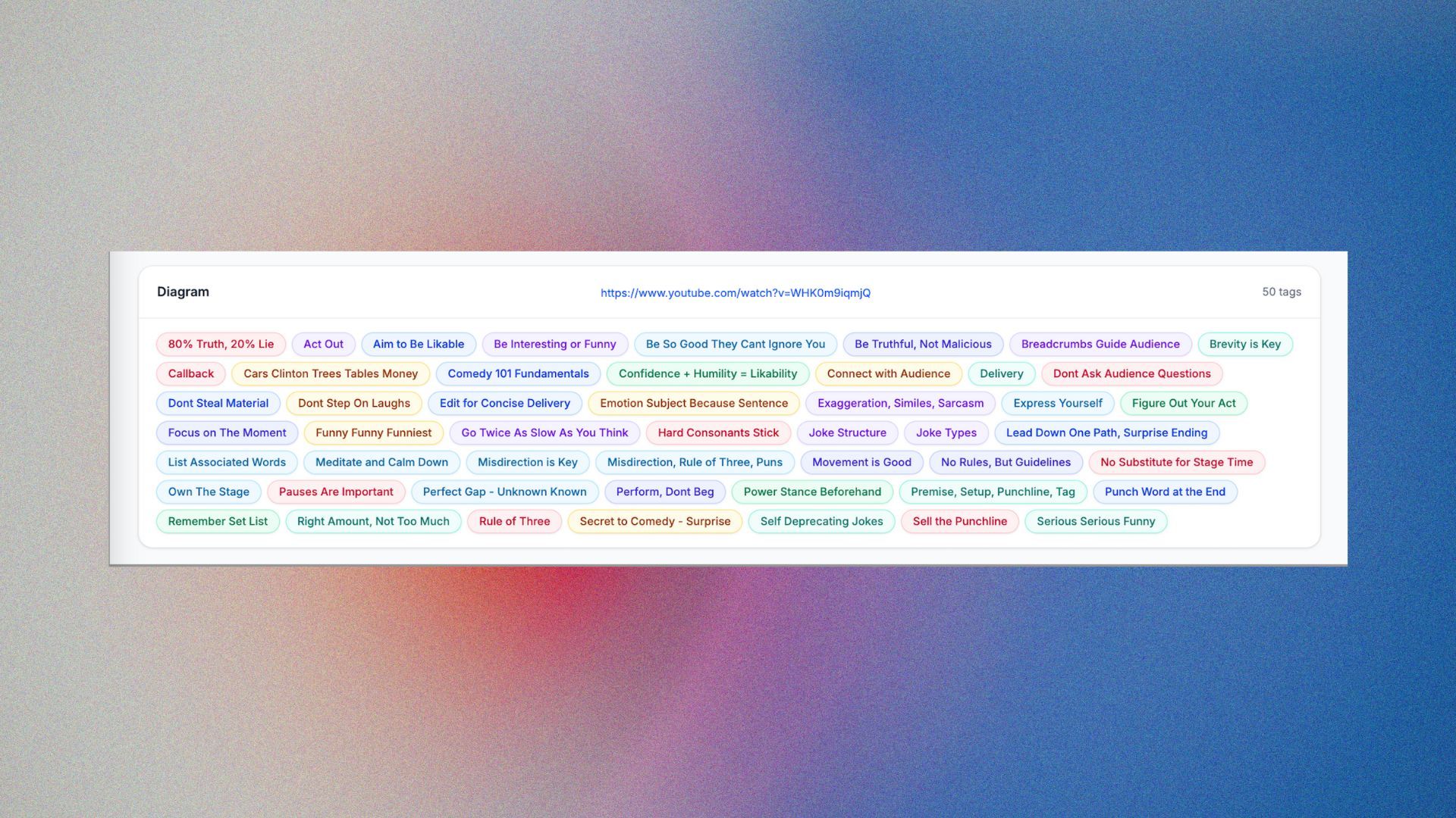 They’re not just design decoration - they’re semantic clues. Each tag captures the recurring concepts, themes, or SEO keywords from a video’s transcript.